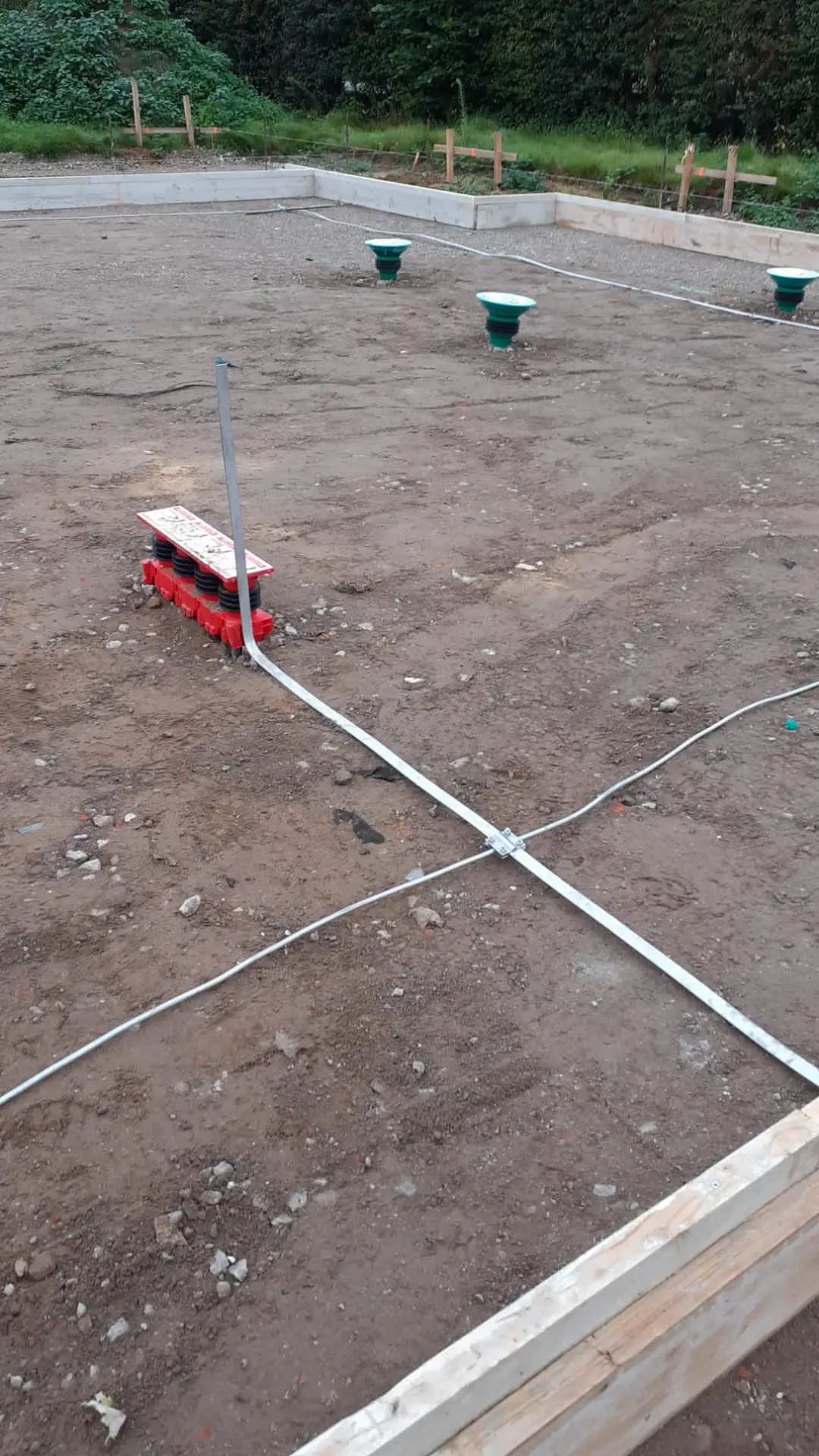 Die Entwässerungsleitungen unterhalb des Baukörpers werden verlegt und es wird eine Sauberkeitsschicht eingebaut.
