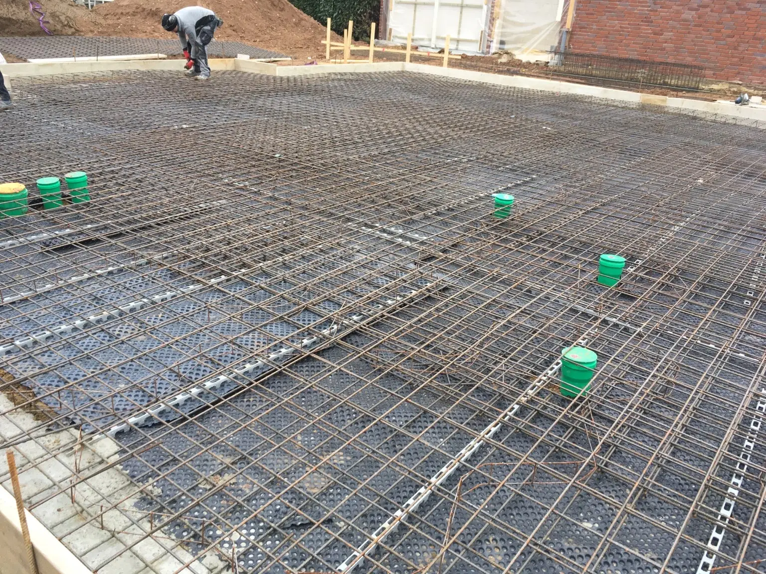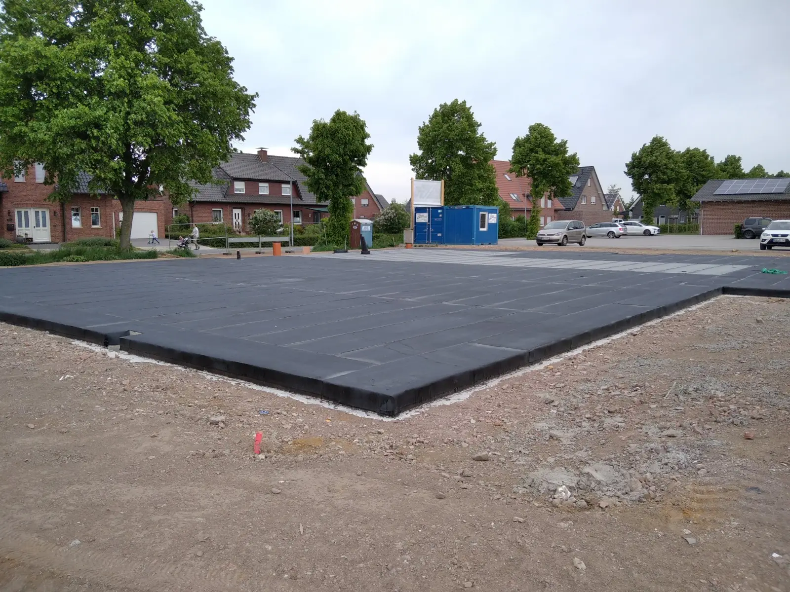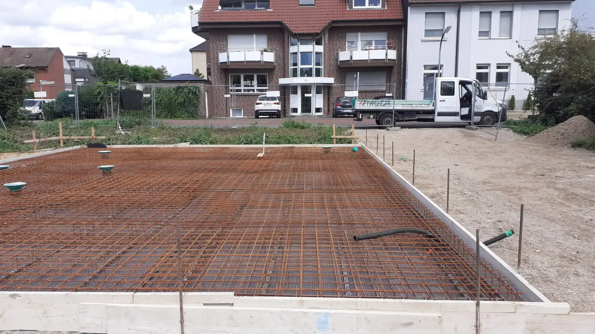 Die Randschalung wird aufgestellt und die Eisenbewehrung wird verlegt. Dann wird die Bodenplatte gegossen und oberseitig mit einer Schweißbahn abgeklebt.