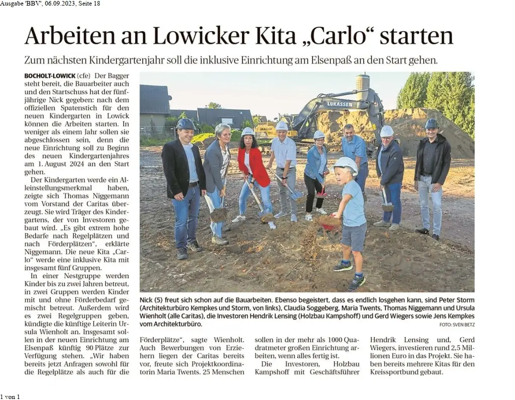 Wir bauen in Bocholt-Lowick eine neue Kindertagesstätte mit 5 Gruppen. Die KiTa wird von der Caritas als inklusive KiTa mit Förderplätzen betrieben. Es werden insgesamt 90 Plätze zur Verfügung stehen. Investoren sind Hendrik Lensing, Geschäftsführer der Kampshoff GmbH und Gerd Wiegers.